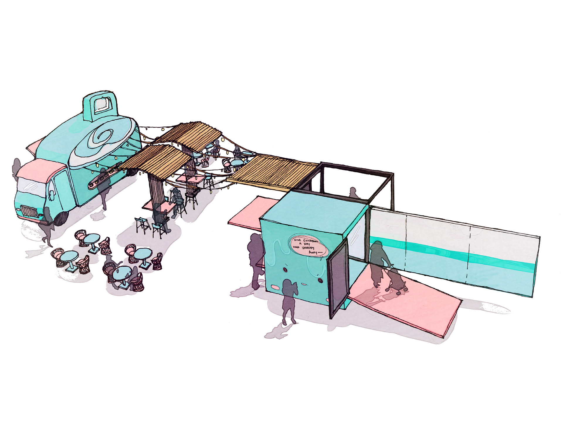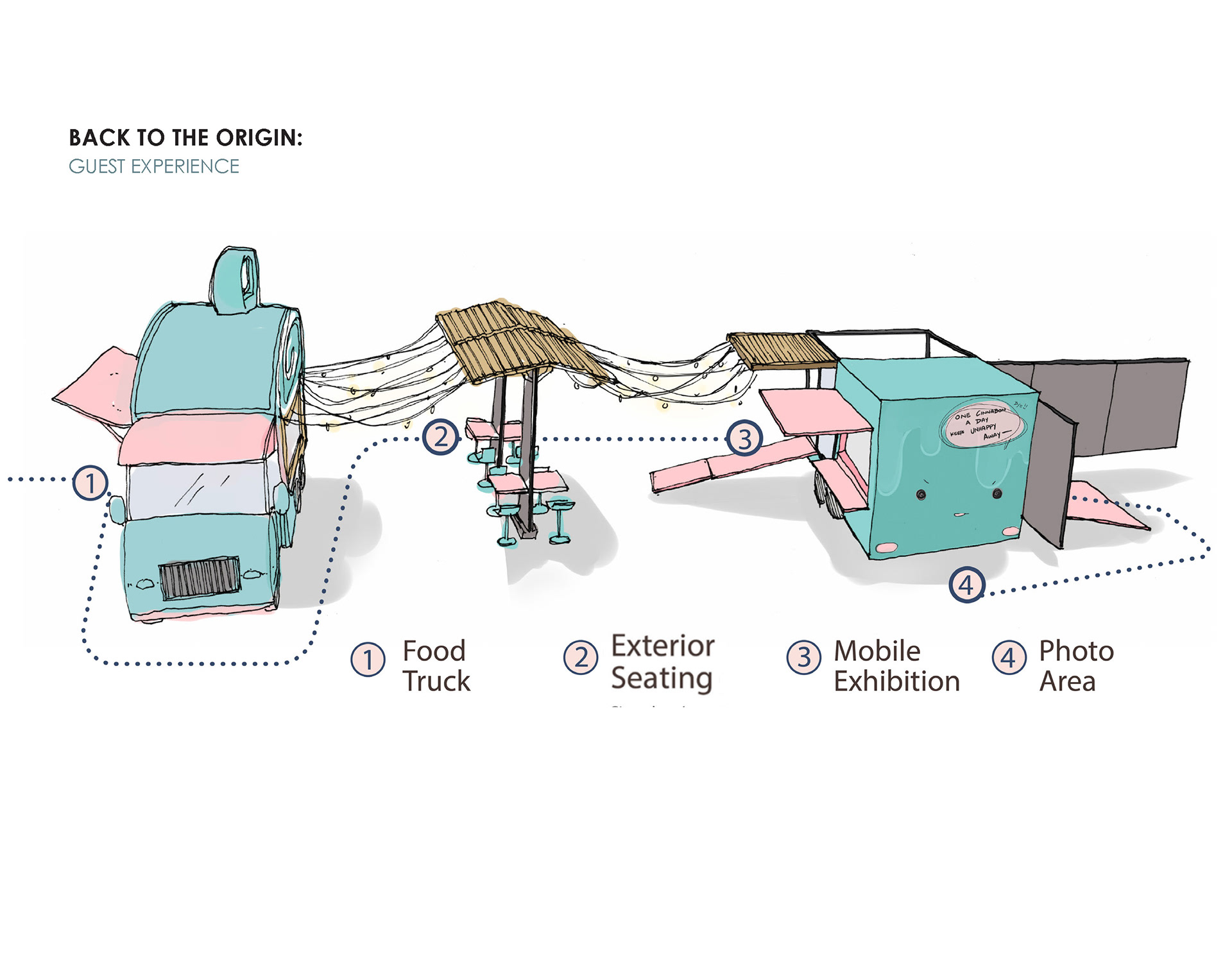 This is a overview on how the customer will explore the food truck, mobile exibition, and seating area.