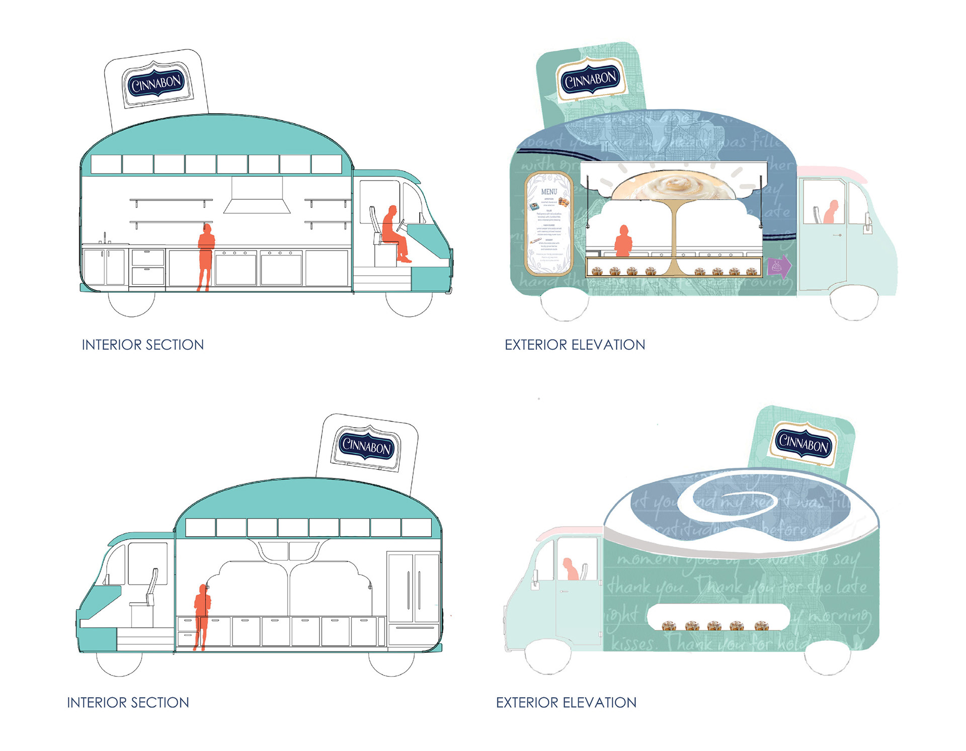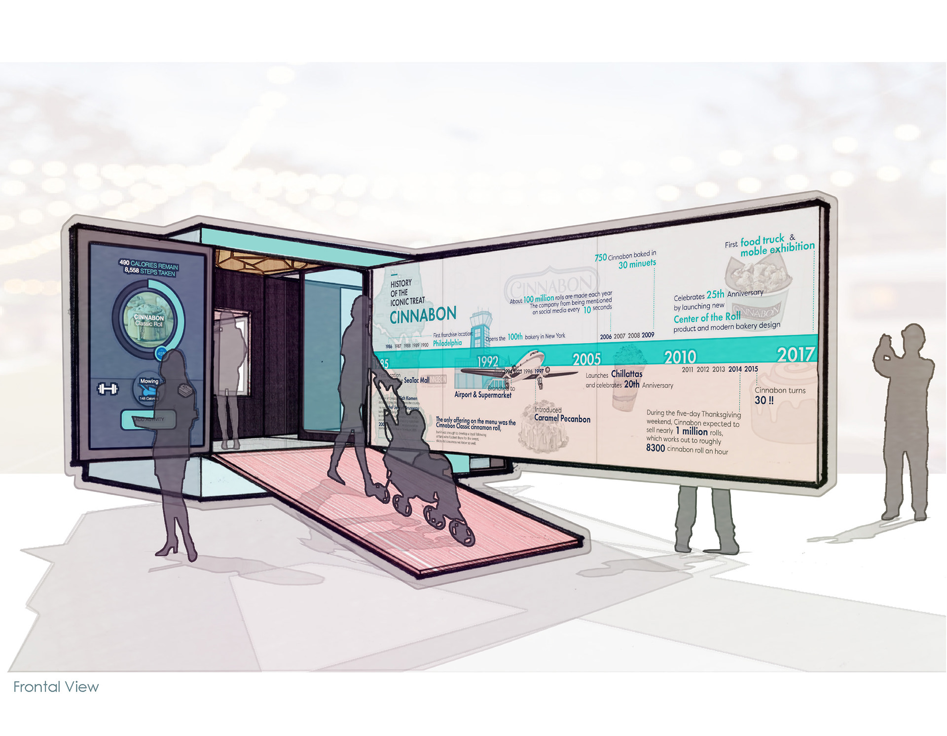 With its irresistible scent and enveloping layers, Cinnabon will take their guest on a journey to the center of the swirl. The design of the food truck and pop-out trailer was inspired by the classic 1980’s automobiles, as well as reimagined the company’s original restaurant in Seatac Washington. The collision of these two major influences will bring out the elements of nostalgia, by integrating the past and the present into the retrofuture.