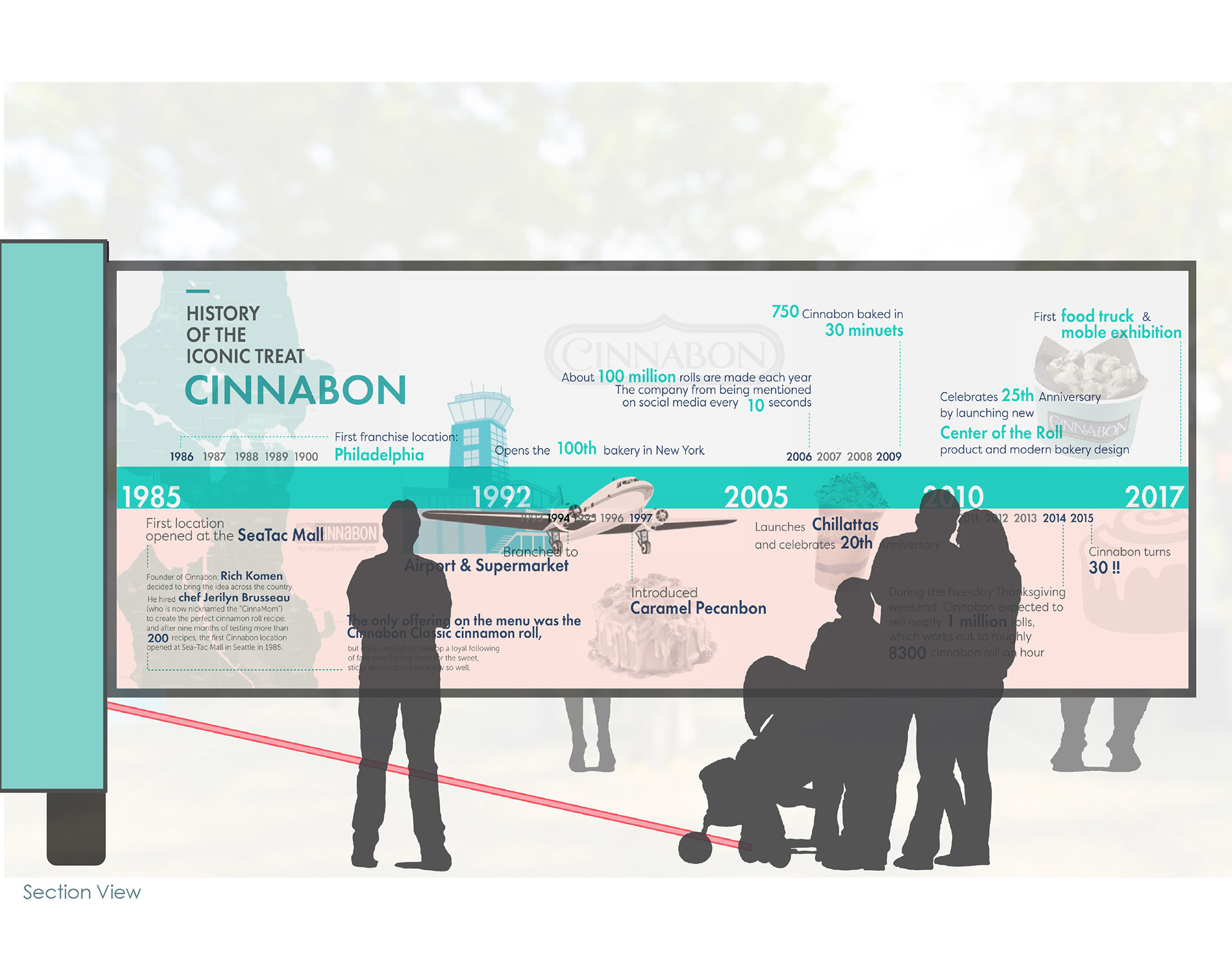 The branding and visual process of the pop-out. The goal of the design is to rebrand Cinnabon by showcasing their origin history and showcase the delicious desert through the pop-out exhibition.