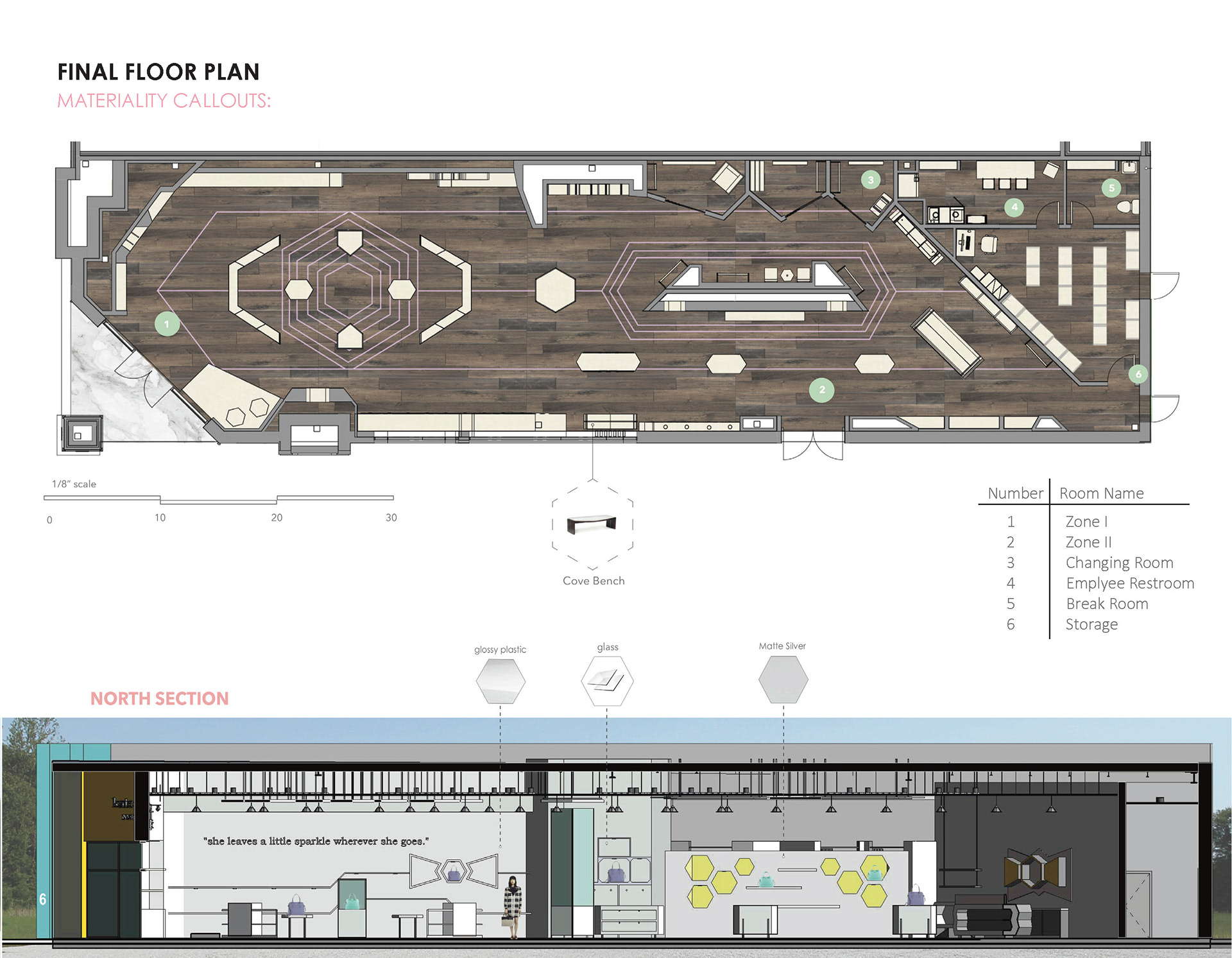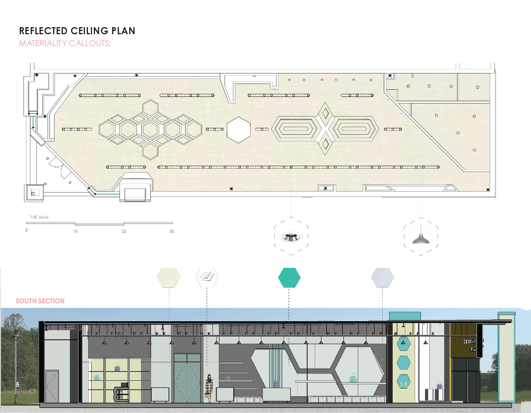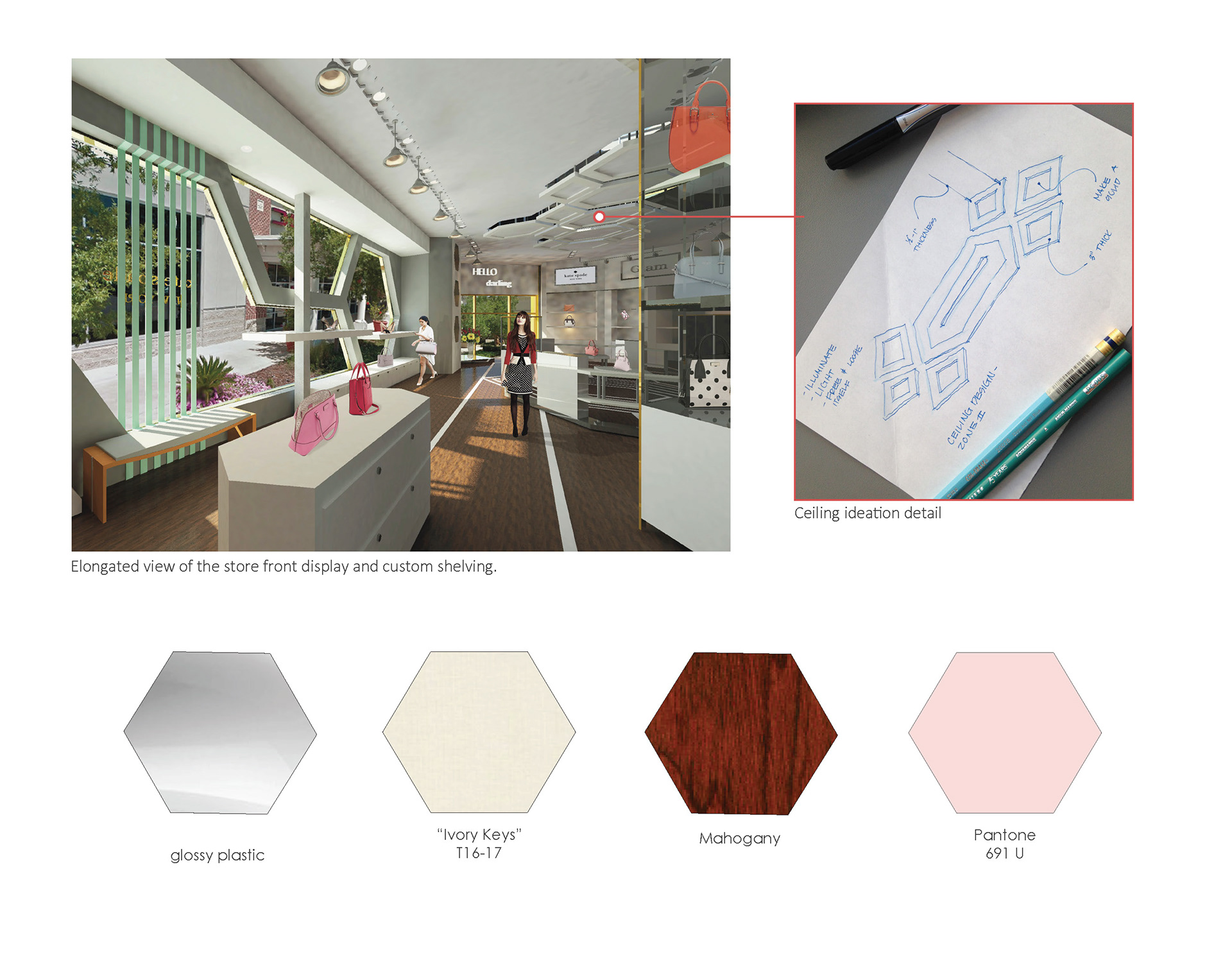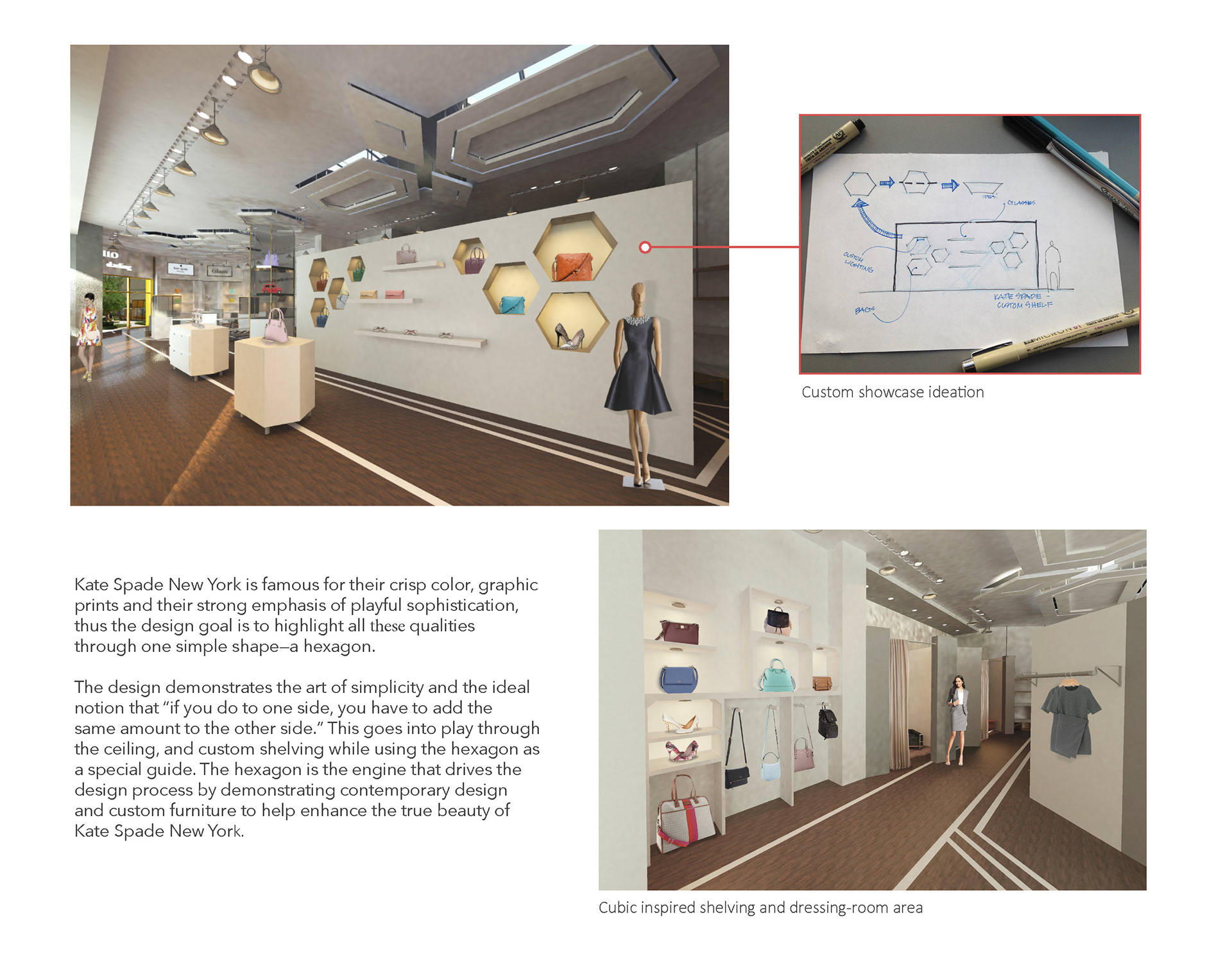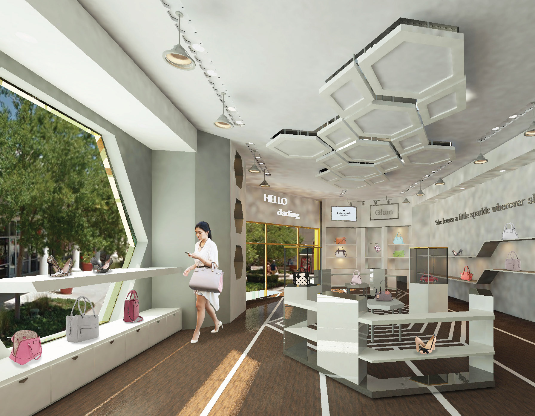 This retail space will showcase Kate Space Brand through its true beauty and strong emphasis of achromatic color schemes. The design language calls for simplify and balance through its usage of simple hexagon pattern motif.
