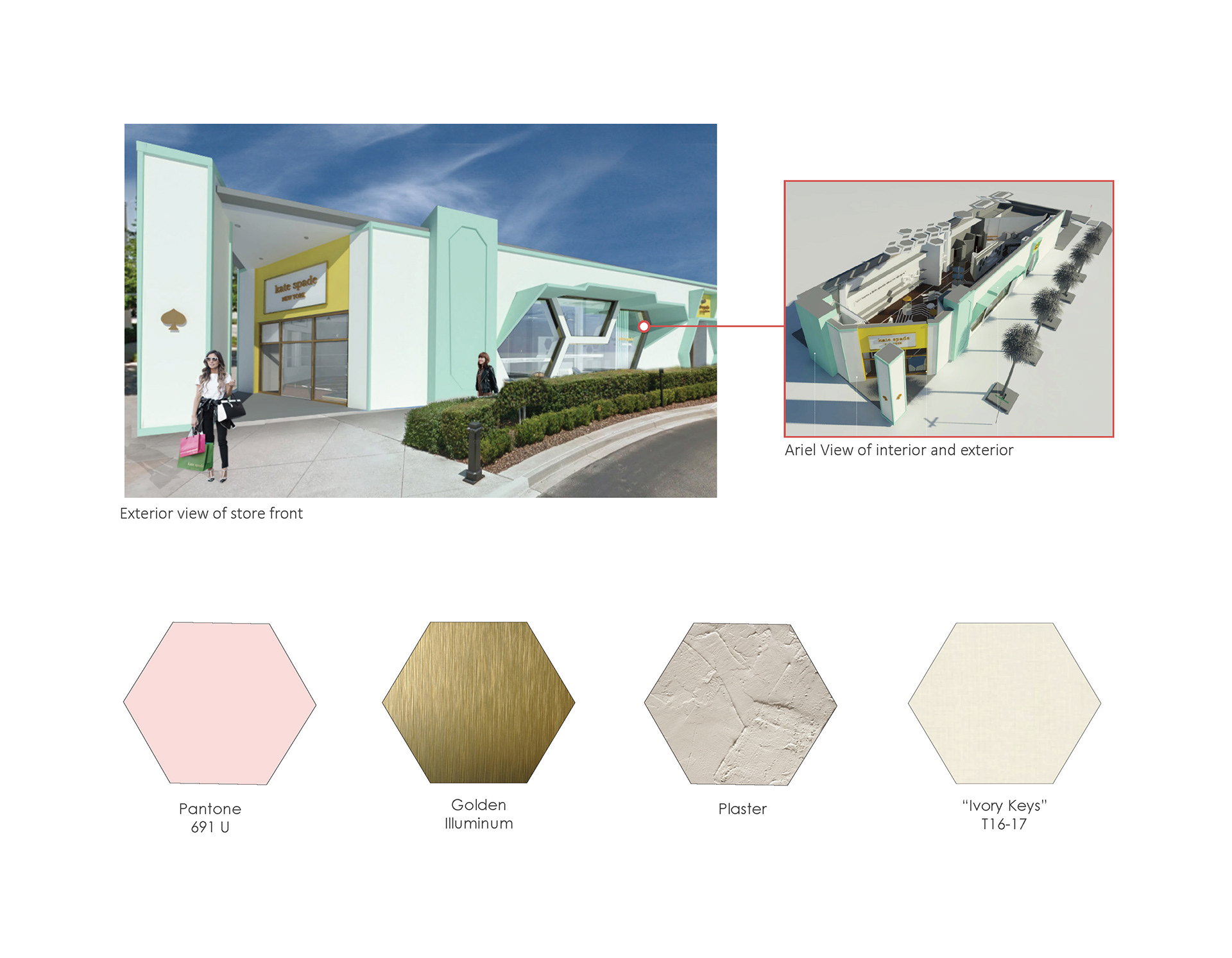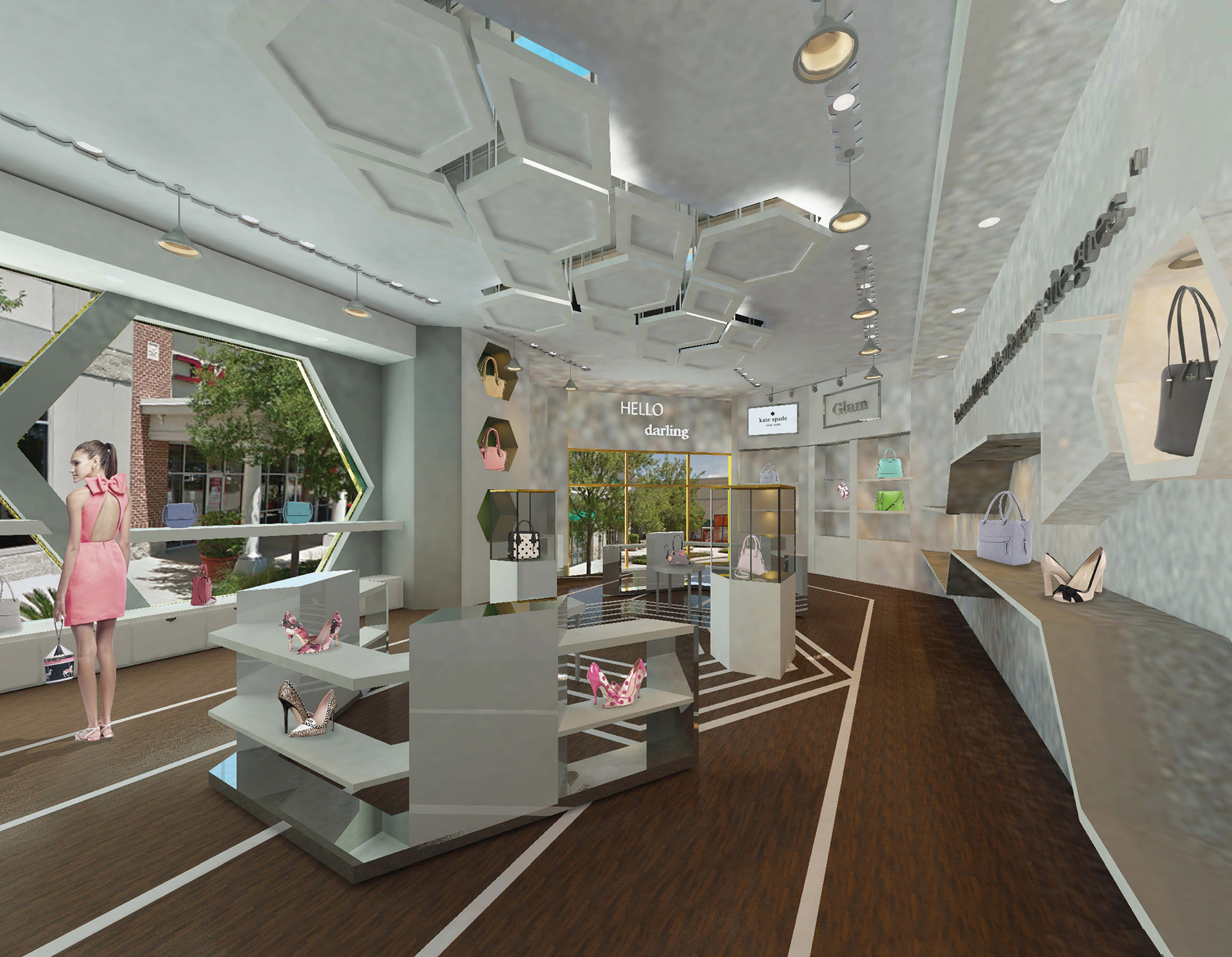 To design a pop-out store from the American fashion company Kate Spade New York, located in the St. John Towns Center in Jacksonville Florida. Kate Spade New York is commonly known for their designer brand that embodied signature concept of bright colors and graphic prints.